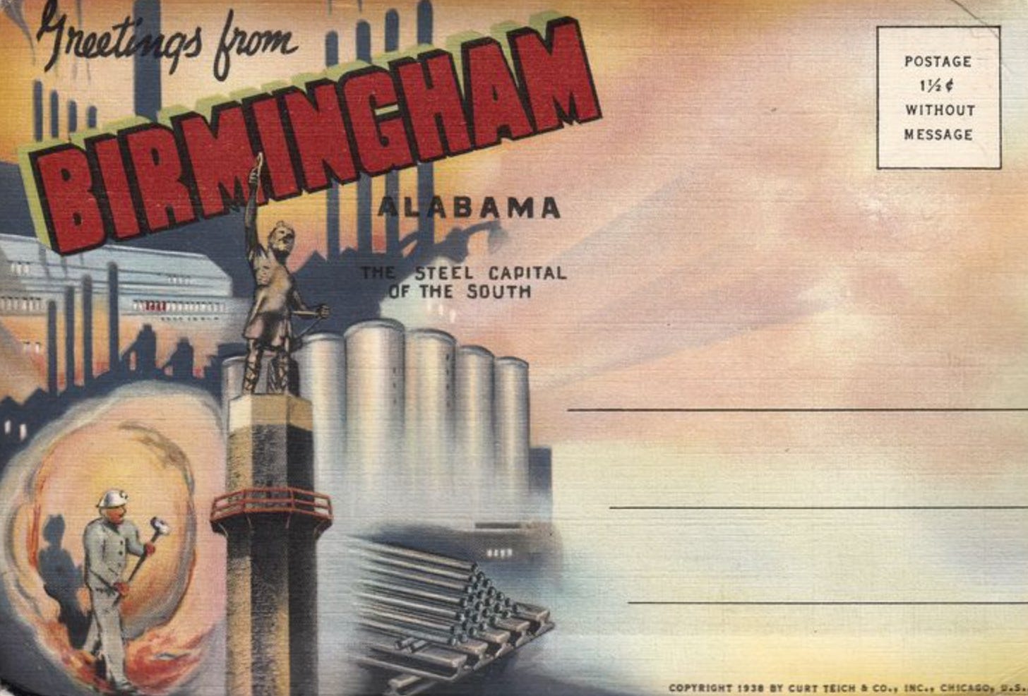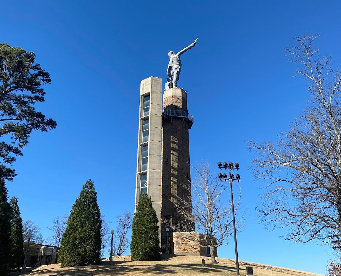 There is, of course, a history here. Birmingham is one of the few — perhaps only — spots on earth with the precise and close-proximity combination of ingredients necessary to make iron: coal, iron ore and lime.2 The iron industry defined Birmingham in its early days, and civic visionaries decided on Vulcan, the Roman god of the forge, to define Birmingham.