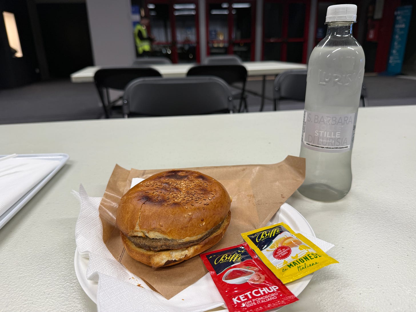OK. So. The Olympics are an exhibition of the world’s finest athletes, physical geniuses who excel at a level unreachable by 99.99 percent of us. However, the Olympics are most assuredly not an exhibition of the world’s finest chefs. The concession stand fare here ranges from “eh, I’d chow on it if I was drunk” to “better off eating the napkins.” This right here is the genuine American-style cheeseburger, which appears to resemble a cheeseburger without incorporating any, you know, flavor. Slather as much ketchup and maionese — that ain’t mustard there — on it as you possibly can. And focus on the brilliance on the ice, not in your hands.