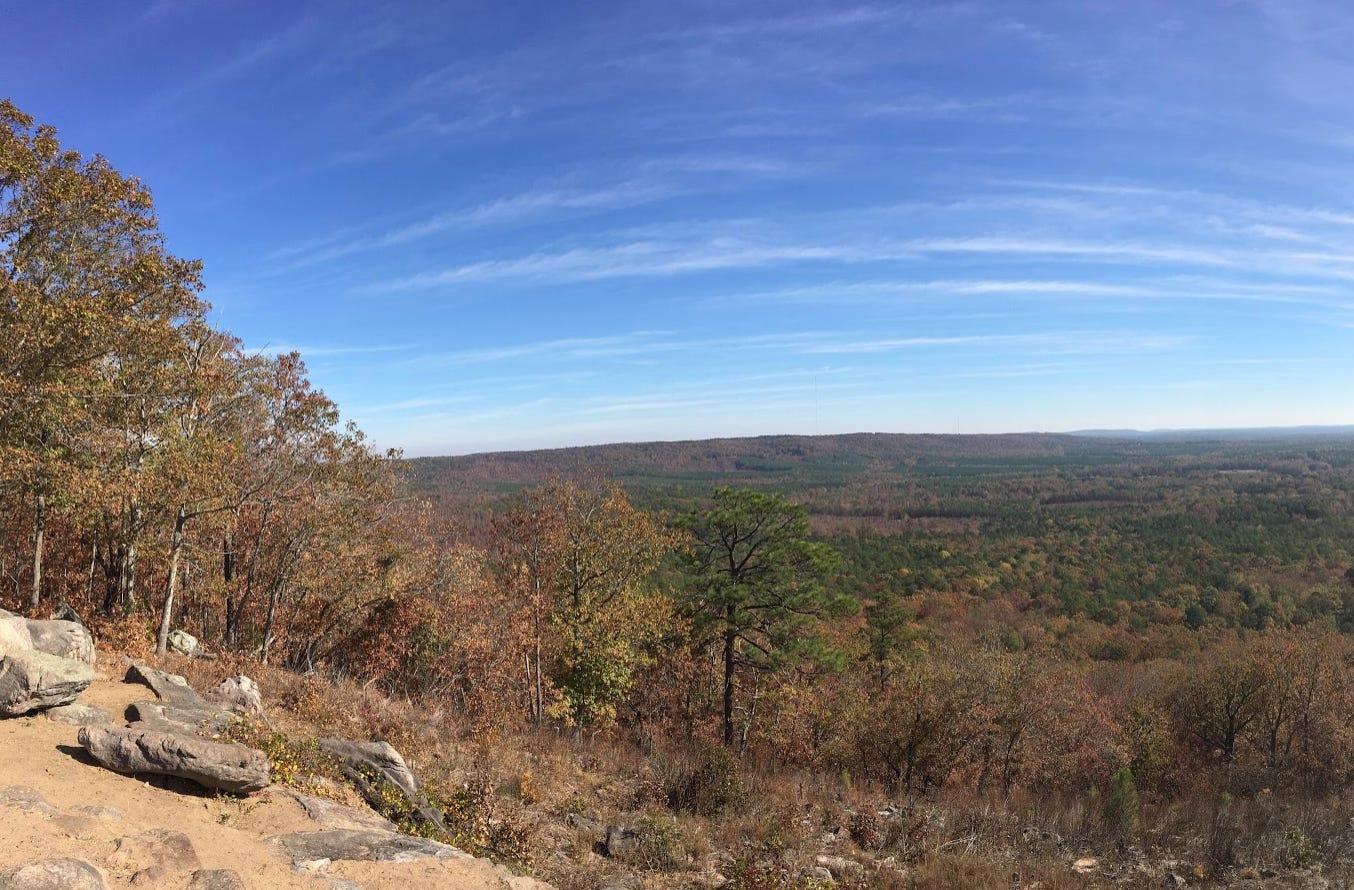 There are only a couple buildings on Pine Mountain, a FDR-era WPA-built rest stop for hikers and, a few miles south, a small restaurant and Southern-kitsch shop. State Route 190, a two-lane highway, traverses the mountain, and hiking trails crisscross it.