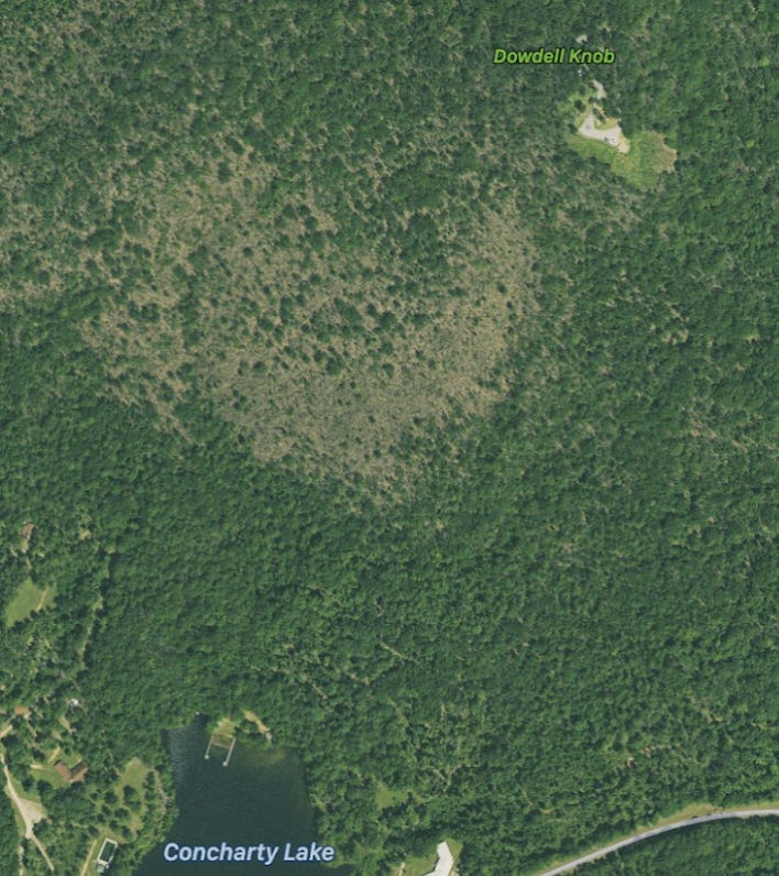 I’ve hiked this area, and I’m no geologist, but I would swear that the rocks, the trees, even the very soil itself changes as you walk westward from Dowdell’s Knob toward the site of the crash. Is 70 years enough time to erase the evidence of a crash like that? I don’t know. If you look at the site from the air, it sure seems like there’s a crescent-shaped scar spreading out directly from where the plane would have impacted: