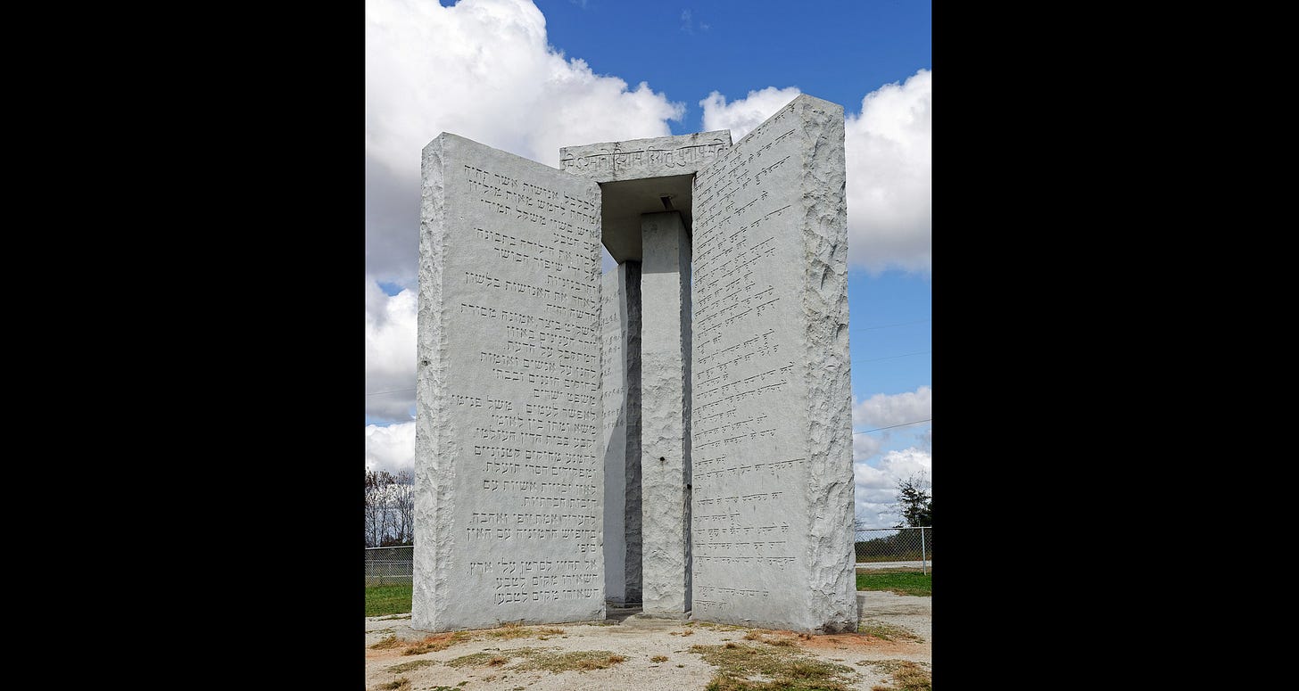 Right up until last Wednesday, several gargantuan, carved granite pillars stood in a lonely, remote field in eastern Georgia. Called the Georgia Guidestones, they were impressive feats of engineering, stones weighing thousands of pounds apiece placed with enough precision that you could literally use them to tell time. They were adorned with observations and guidance that, depending on your mindset, read as anything from benign to Satanic.