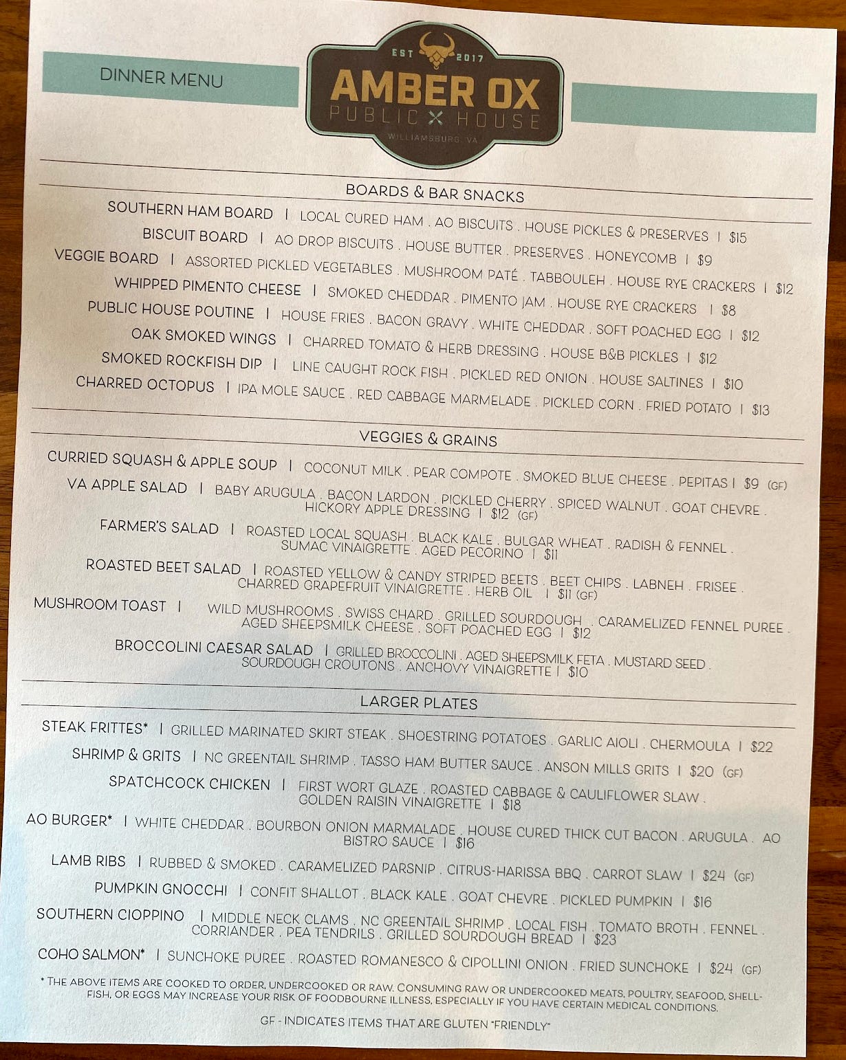 Menu of the Week: Amber Ox, Willamsburg, Virginia