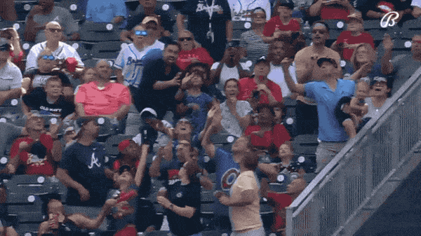 For the love of God, be careful when you do this. You could miss the ball and someone else could catch it! Oh, right, and you could drop your kid over a fence. That too. Man, Braves fans are something special.