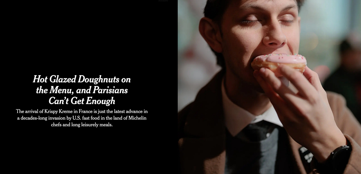 The story details the opening of the first Krispy Kreme store in France, a full-on American-style, definitely-not-staged social media spectacle with hungry influencers camping out the night before, then streaming their treasures to other French youths, who in turn descended on the shop. The Krispy Kreme is located on Passage de la Canopée, which is a so much prettier address than, like, “Tennessee Street” or “Route 301” or wherever the hell most American ones are sited. It’s a couple blocks from the Louvre and Notre Dame Cathedral, housed in a building that once hosted a Michelin-starred chef’s restaurant. You don’t need a degree in urban planning — or French literature — to see the metaphor at work here.