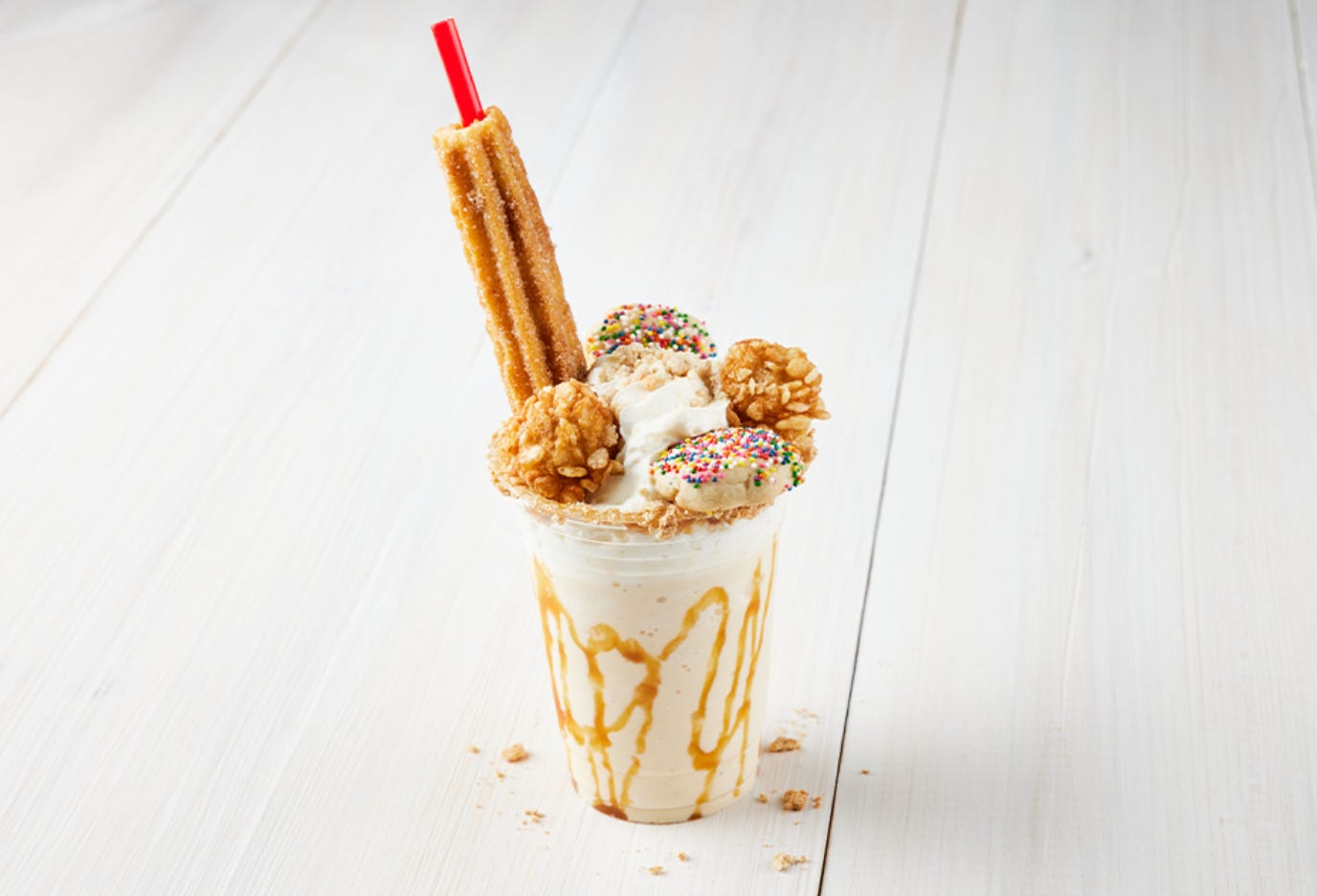 Look at that milkshake. LOOK AT IT. Horchata made with milk and cream and caramel drizzle, topped with … I dunno, a bunch of fried sweet dough blobs and sprinkles and a churro and all kinds of other delicious junk. I would absolutely annihilate one of these on a hot Texas fair afternoon, and so would you.