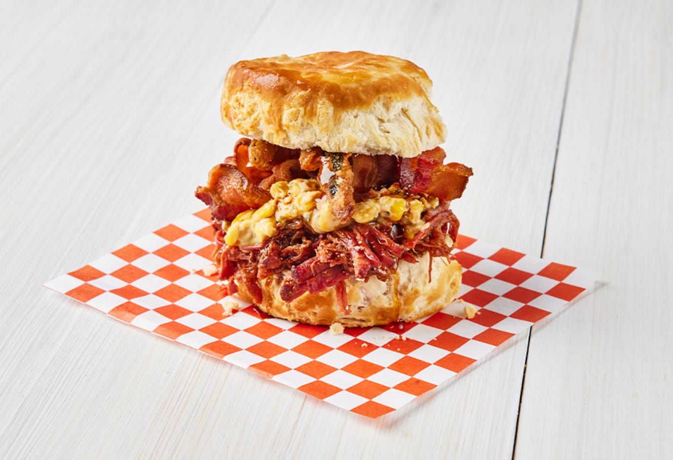 Behold, the masterpiece of 2022. A golden biscuit filled with brisket and street corn, topped with honey-cooked bacon and fried-pickle fries. I will form my own religious order based on this biscuit, and the communion line will stretch around the block.