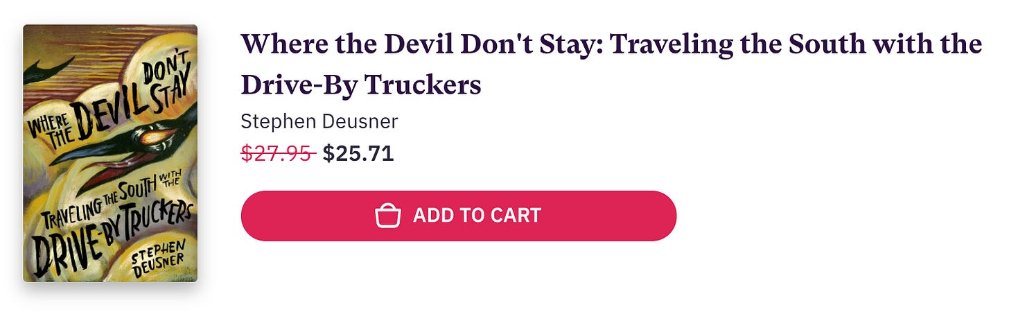 I’ll do a deep dive on the Truckers one of these days, but I’ll have to work hard to do anything close to the level of Stephen Deusner’s “Where the Devil Don’t Stay,” a brilliant travelogue/biography/meditation on what it means to be a Southern rock band in an era when all three of those words are slipping loose from their longtime meanings. It might be the best book I’ve read this year, and I can’t recommend it highly enough. Click below to go to the ol’ F&AB Bookstore and grab a copy: