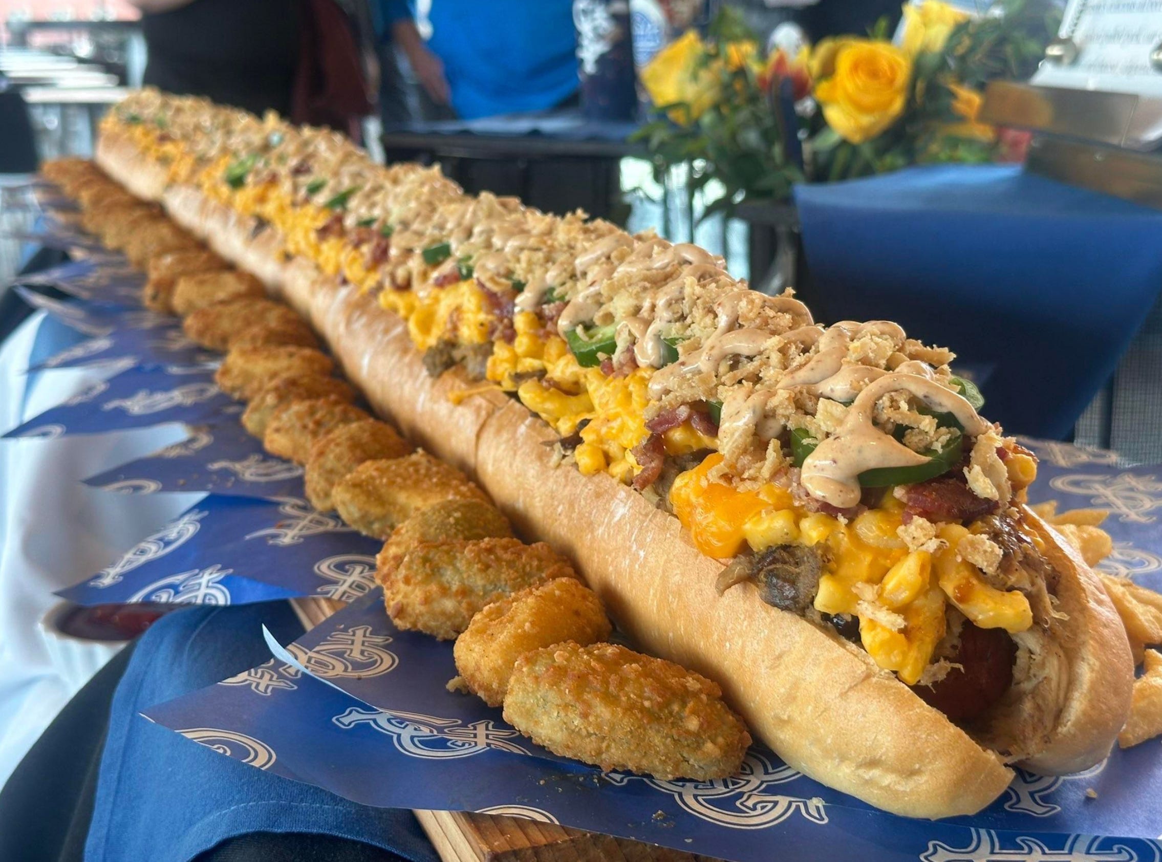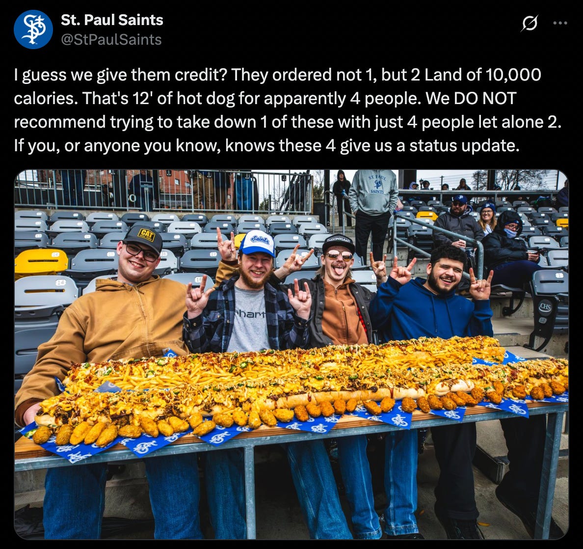 God bless baseball season, because every spring brings renewal, rebirth and a glorious array of stunt food. This one here is from the St. Paul (Minn.) Saints, and it’s called “Land of 10,000 Calories.” What you have here is a massive, six-foot-long beef hot dog, topped with pulled pork, cheddar mac and cheese, jalapeños and a “fried onion topping.” Costs $130, and it’s recommended for 10-12 people. Or, if you’re an absolute lunatic, two: