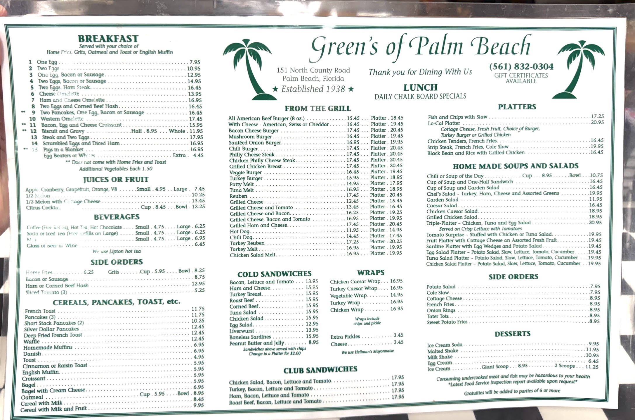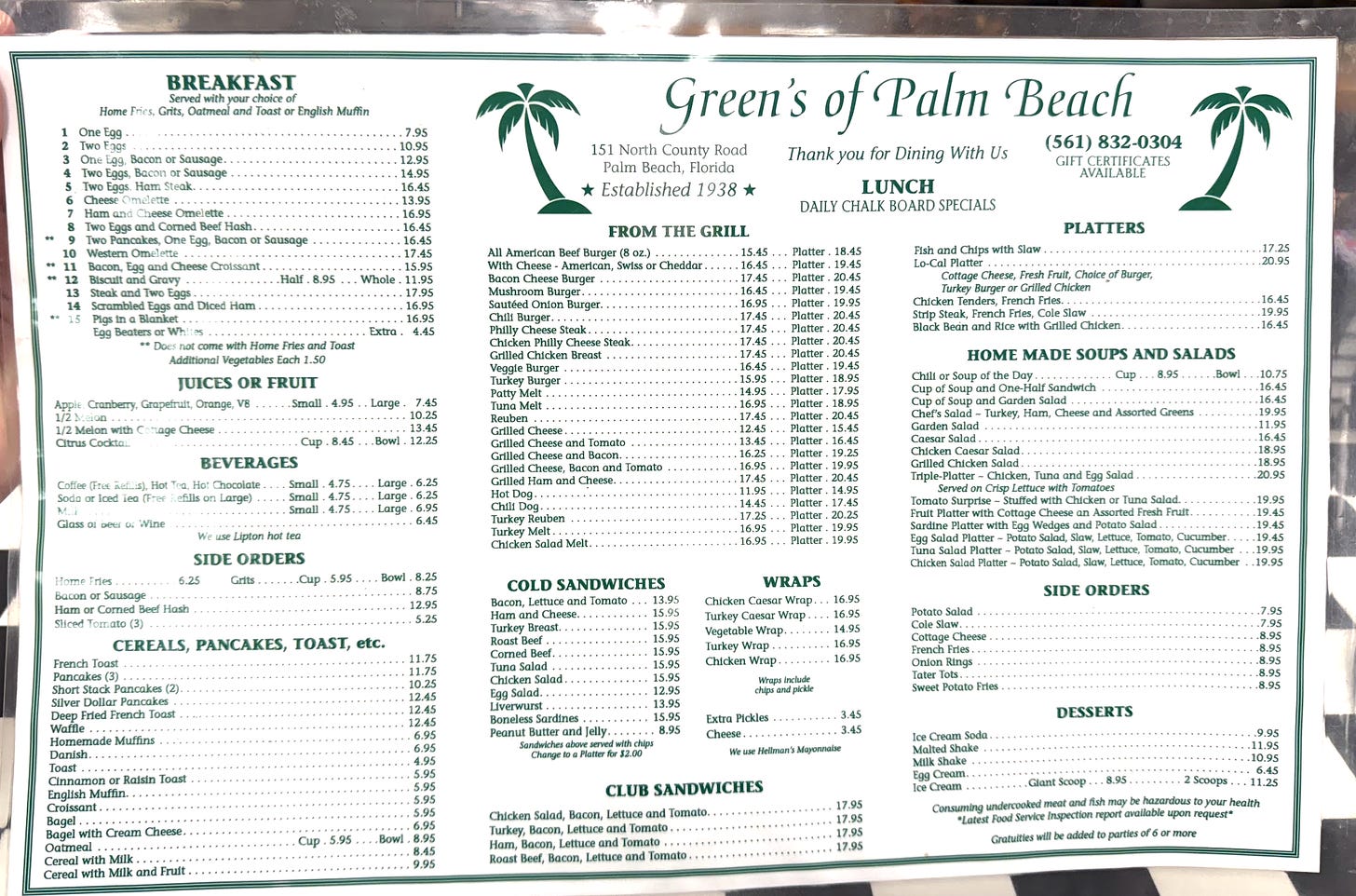Anyway, yes, the cost of a burger and fries at Green’s is flat-out outrageous … to me. But then I didn’t grow up at that counter, visiting with my parents or grandparents as a child, bringing my kids as an adult. The weight of nostalgia is a powerful one — and a costly one, too, if the purveyors of such nostalgia are so inclined. (Green’s is located in one of the wealthiest zip codes in the entire country, right up the road from Mar-a-Lago, so I’m not feeling too sorry for the regulars there.)