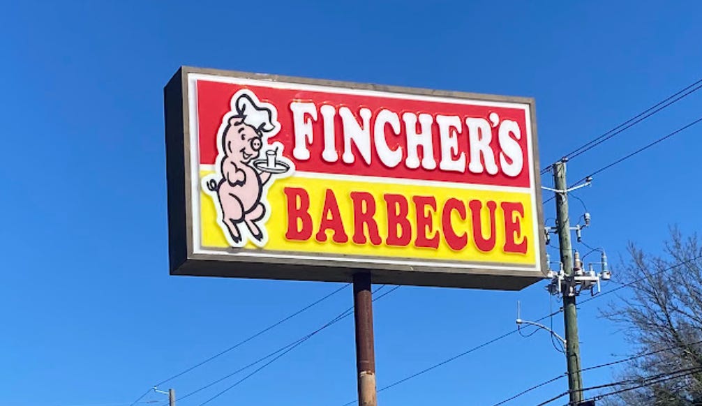 Last Saturday, I was on my way to Jacksonville to cover what turned out to be one of the better football games I’ve ever seen. En route, I did what I always do out on the highway: sought out the best barbecue along the route. That brought me to Fincher’s Barbecue on Houston Avenue in Macon, Ga., a restaurant that retains so much of the charm and character it’s had since Doug “Dude” Fincher Sr. opened it in 1935. The yellow-and-red sign against the brilliant blue of the sky, the rows of tin sheds for long-ago drive-up customers in the parking lot, the outdoor walkup window, the circular spinning stools running along the low counter, the well-stuffed red booths … it was all perfect.