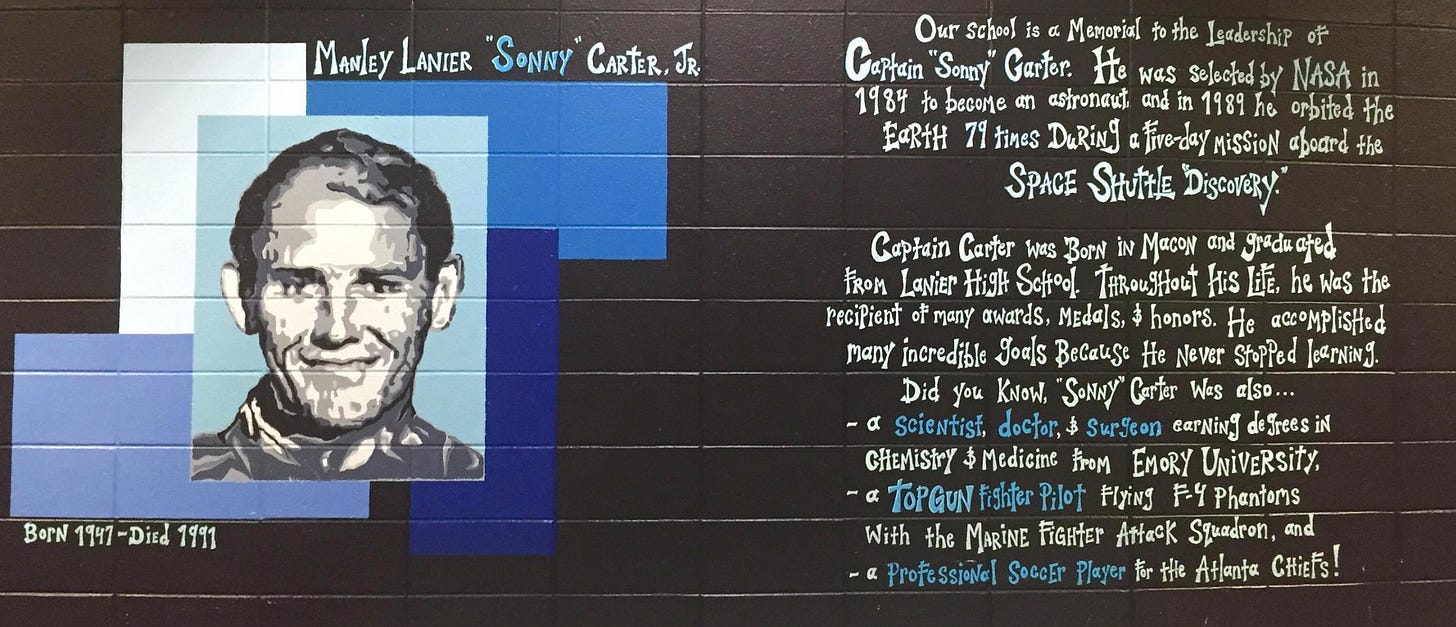 An elementary school in Macon now bears Sonny’s name; his 1989 mission patch is the school’s logo. Here’s the mural honoring him: