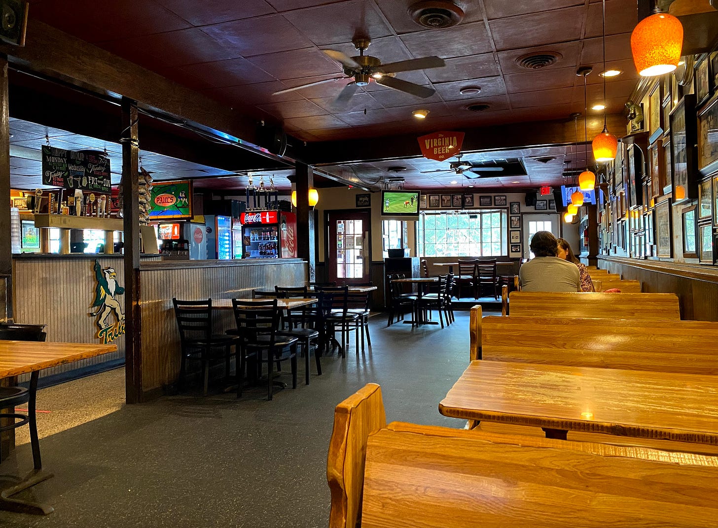 Even if you’ve never been to Paul’s Deli — and it’s not a deli, that’s just a name, I have no idea why — you know what it’s like inside. The timeless decor of dark paneling and recessed lighting. Framed photographs of W&M athletes past decorate the walls. (I commissioned a few of those photos when I was sports editor of the student newspaper. The fact that they’re now old and yellowed, like Civil War daguerrotypes, is disturbing as hell.) Signed jerseys hang around the place. Look closely at the photographs, and every once in awhile you’ll see a familiar face. (Wait, is that Tom Brady? Standing right here by this same booth where his picture now hangs?)
