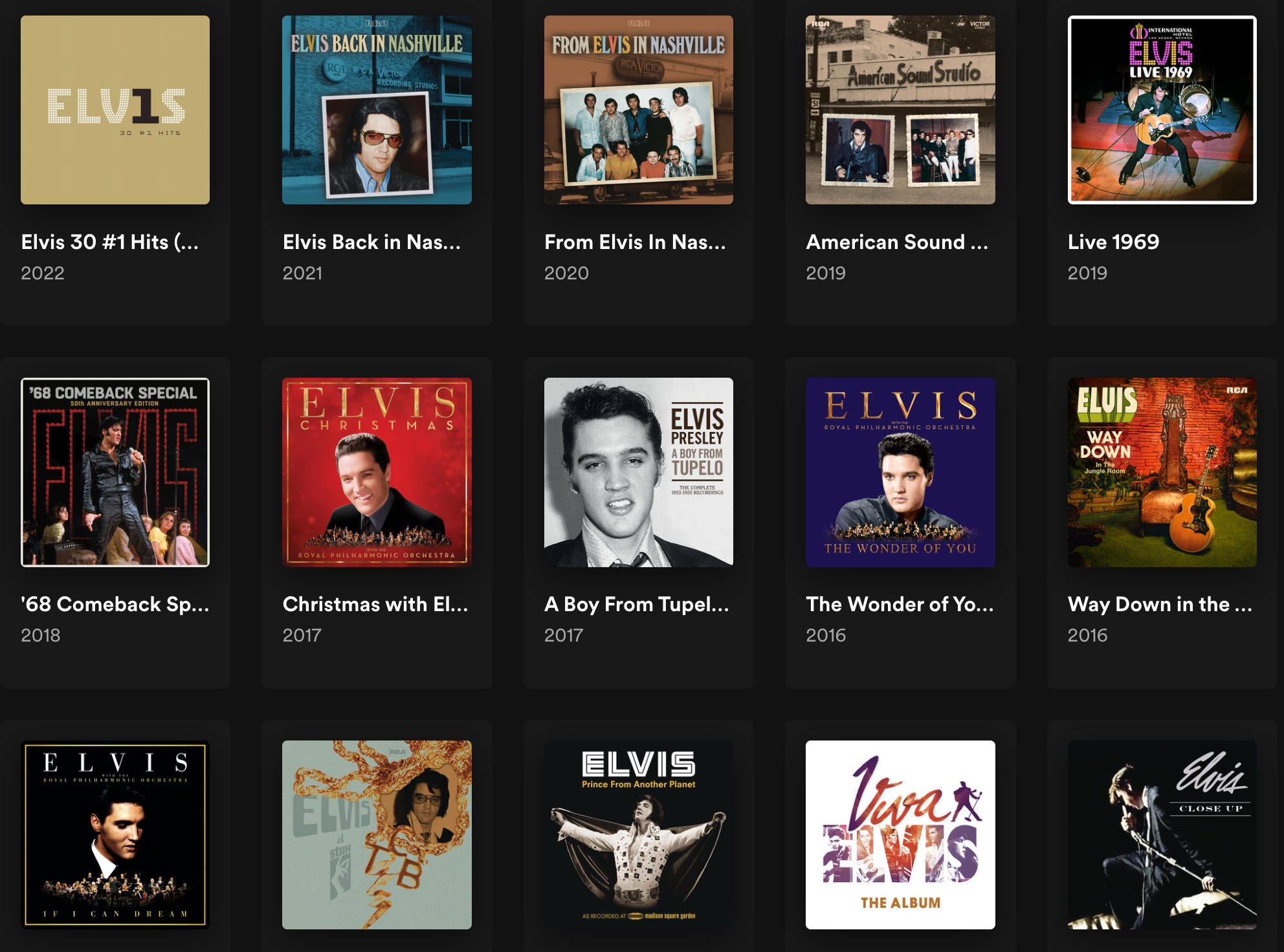 Beyond all that, the simple truth is this: after nearly 50 years gone, Elvis doesn’t have any more secrets. The curators of his musical legacy trot out at least an album a year — as you can see above, he’s released at least 12 “new” albums in the last decade — repackaging and reworking the reliable ol’ hits into new compilations. It’s all just rearranging the same old furniture. He boasts 13 million monthly listeners on Spotify, which sounds impressive until you see that he’s only ranked 348th in the world.